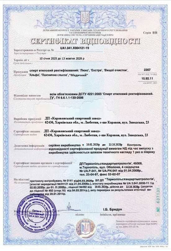 Ми пропонуємо спирт, виготовлений згідно з усіма нормами та стандартами якості, що підтверджується: